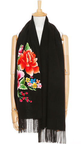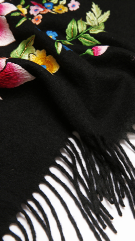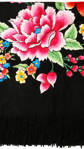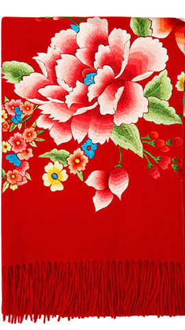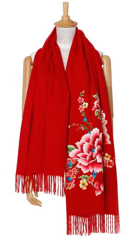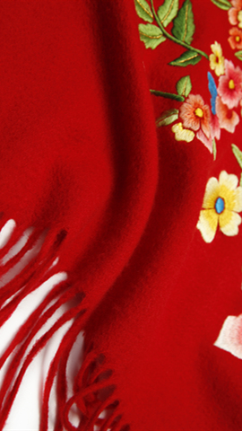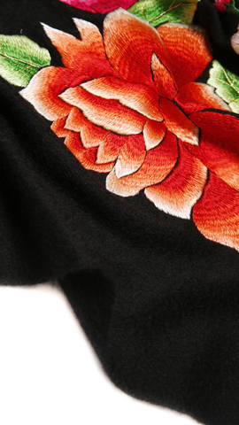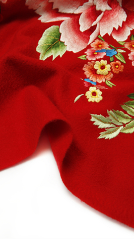 采用长短针实绣相结合的苏绣针法,一针一线地于羊绒底胚上描绘出牡丹明艳而绽的雍容姿态,层层叠叠的花瓣里蕴含花开美意。